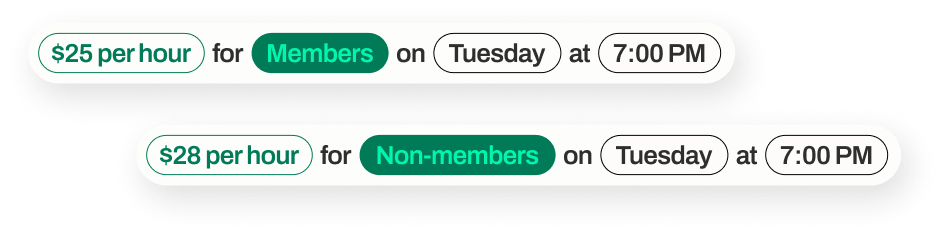 Instead, Peak Play uses AllBooked’s pricing rules and user tags to apply the correct pricing automatically. If someone books a court on Tuesday at 7:00 PM, the system immediately shows the appropriate rate: $25 for members, $28 for non-members, and a special rate for coaches.