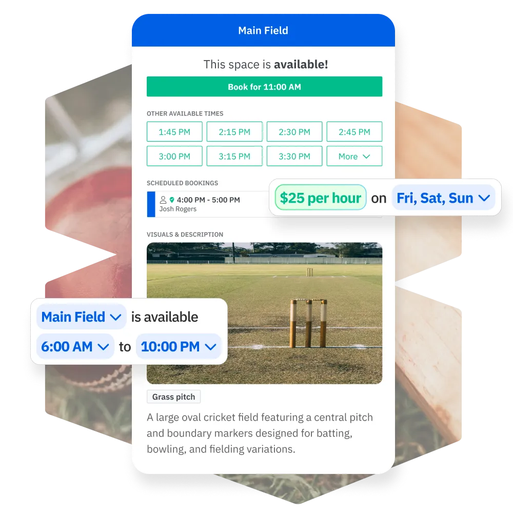 AllBooked provides a centralized system for managing cricket field and cricket pitch availability in real time. Operators can configure full cricket fields, define session lengths, and control availability for matches, practices, or training sessions. Whether bookings are made online or managed by staff, the system keeps schedules accurate and prevents conflicts, making it easier to manage cricket grounds used by multiple teams or groups.